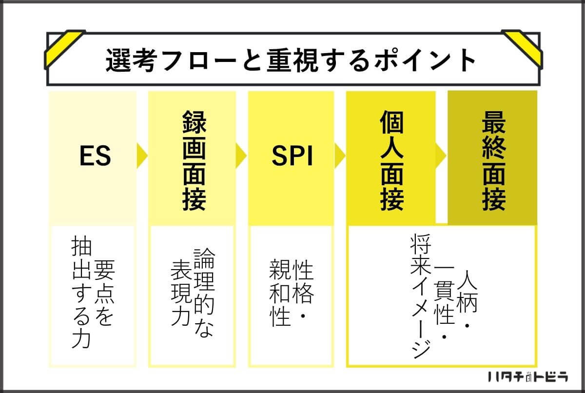 選考は、エントリーシート(ES)→録画面接→SPI→個人面接→最終面接の5段階で行われます。