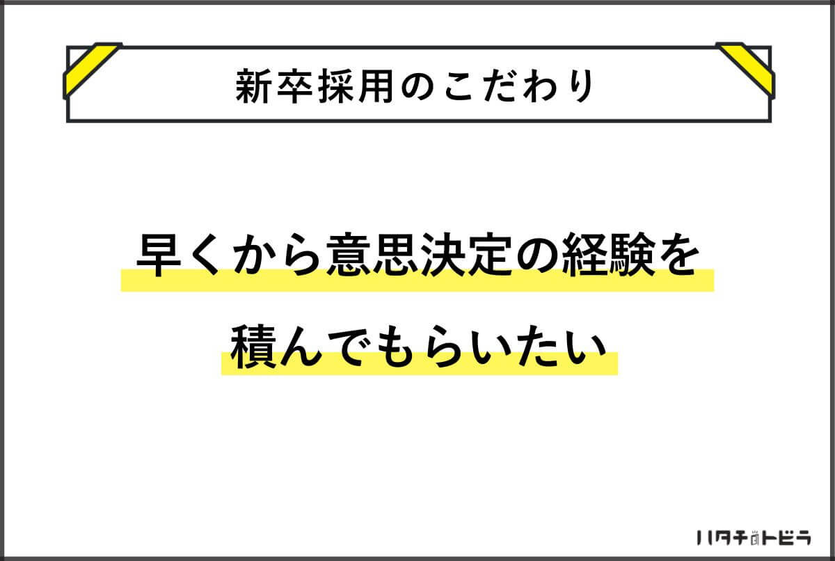 また、これからの時代「意思決定」が人間の重要な仕事になると考えており、新卒に期待するのは、早い段階から意思決定の側に立って経験を積み、チームや事業を前に進める存在になってもらうことです。